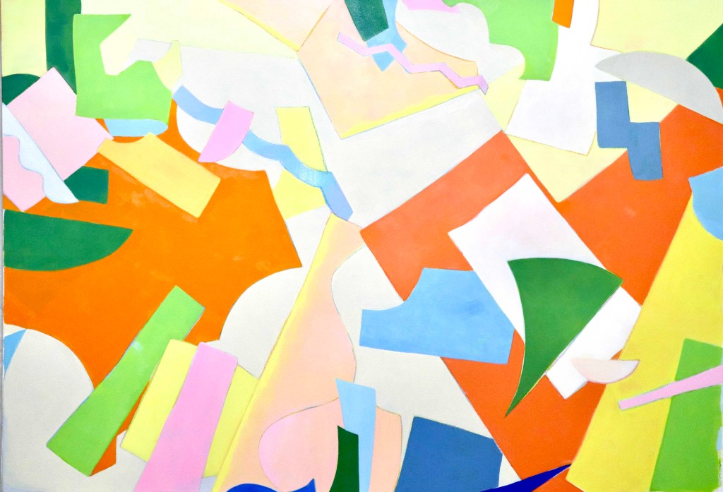 カラーフェルトに絵の具を重ね、それをランダムに切ったものをモチーフとして描いている。たくさんのフェルトのパーツを床に放り投げるように置いていく。フェルトのパーツは光を吸収したり反射したり、絵具とは異なる色の危うさを持っている。色とパーツの重なりとが複雑な空間を演出する。木津本にとってフェルトという素材には、幼少期に母親が作ってくれたままごとのおもちゃの記憶が結びついており、身体に沈んでいる“手触りの記憶”を呼び起こす存在である。キャンバスやフェルトに色を乗せる行為は、時間や空間を押し込む作業でもあり、素材、色、自分自身と対話しながら作品を制作している。